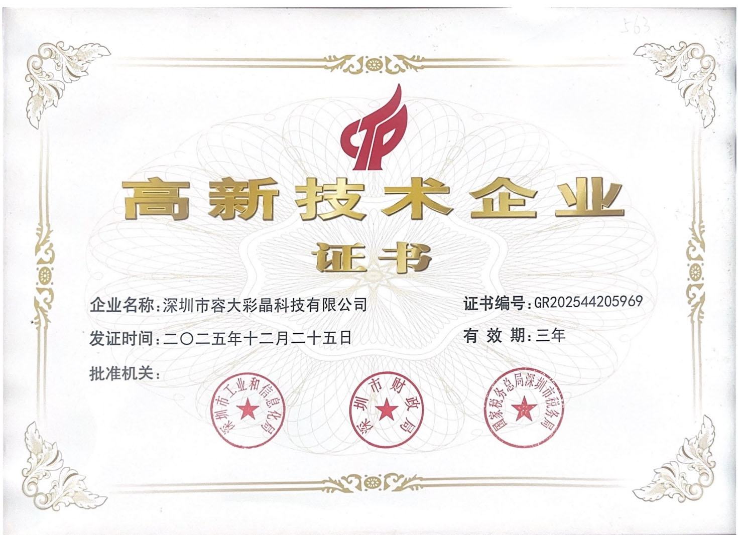 近日,深圳市容大彩晶科技有限公司(以下簡稱“容大彩晶”)成功通過國家高新技術(shù)企業(yè)認(rèn)定。這一殊榮標(biāo)志著公司在技術(shù)研發(fā)、自主創(chuàng)新及成果轉(zhuǎn)化等方面獲得了國家級權(quán)威認(rèn)可。